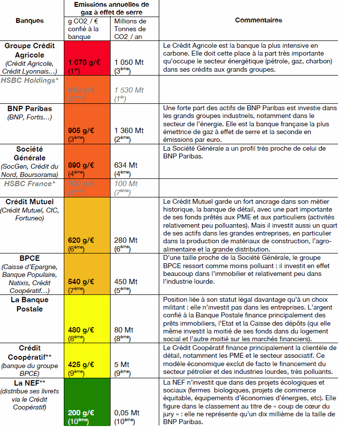 Le cabinet de conseil Utopies et l’association Les Amis de la Terre ont publié le 22 novembre le premier classement carbone des grandes banques françaises. (Source : http://www.notre-planete.info)