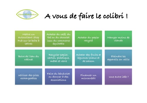 A la fin de la conférence, tous les participants ont été invité à devenir des petits colibris, en s’engageant à faire au moins un geste parmi les 12 proposés. Les participants sont invités à publier leur engagement ici, en postant un commentaire sur cet article !