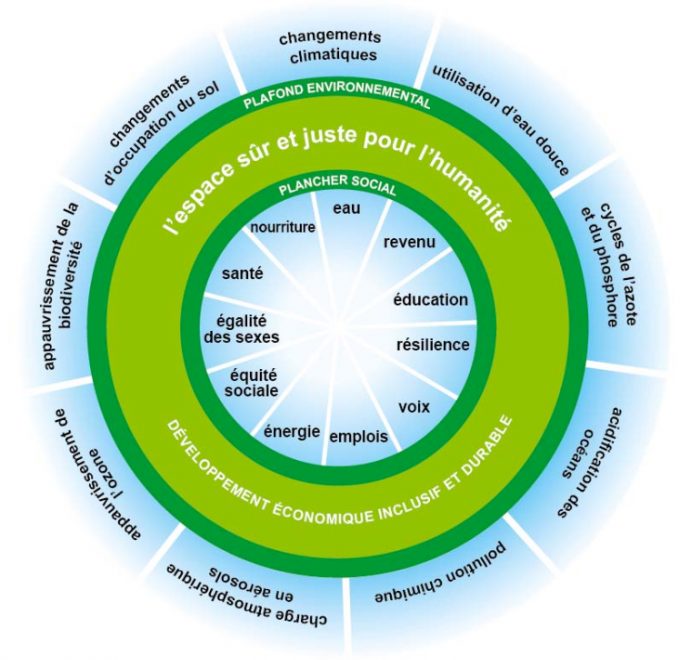 Une économiste britannique, Kate Raworth, a particulièrement réussi dans ce domaine, en popularisant le modèle économique du « Donut ». Pourquoi un « Donut » ? Parce que son modèle ressemble au célèbre beignet anglo-saxon (voir illustration ci-dessus):