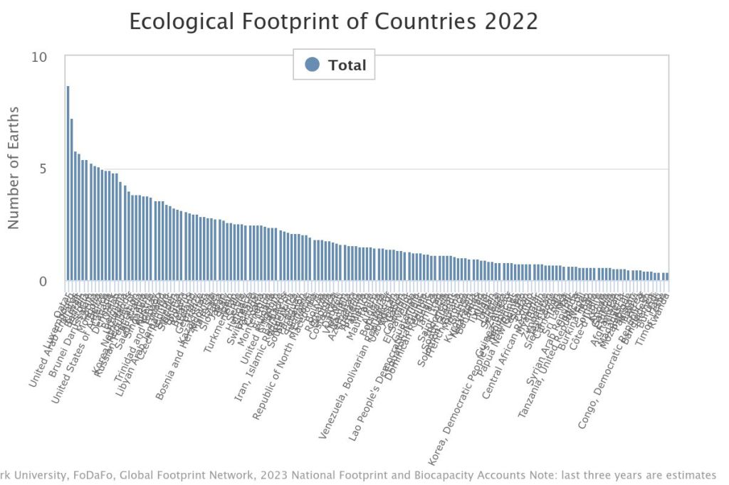 Les USA sont évidemment dans le peloton de tête avec une empreinte de 4,94 planète, mais ils sont devancés par 10 autres pays. La France est en 36e position avec 2,86 planète.