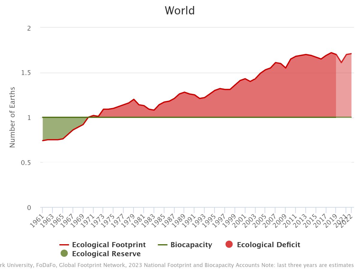 En 2022, on estimait que l’humanité utilisait la surface d’environ 1,72 planète Terre par an, ce qui n’est évidemment pas soutenable à long terme. Le graphe ci-dessous (source : Global Footprint Network) montre comment cette empreinte globale s’est dégradée depuis les années 1960. Et on voit déjà depuis plusieurs années les dégâts que cela engendre : dérèglement climatique, déforestation, effondrement de la biodiversité, pollution plastique, contamination de l’eau, etc.