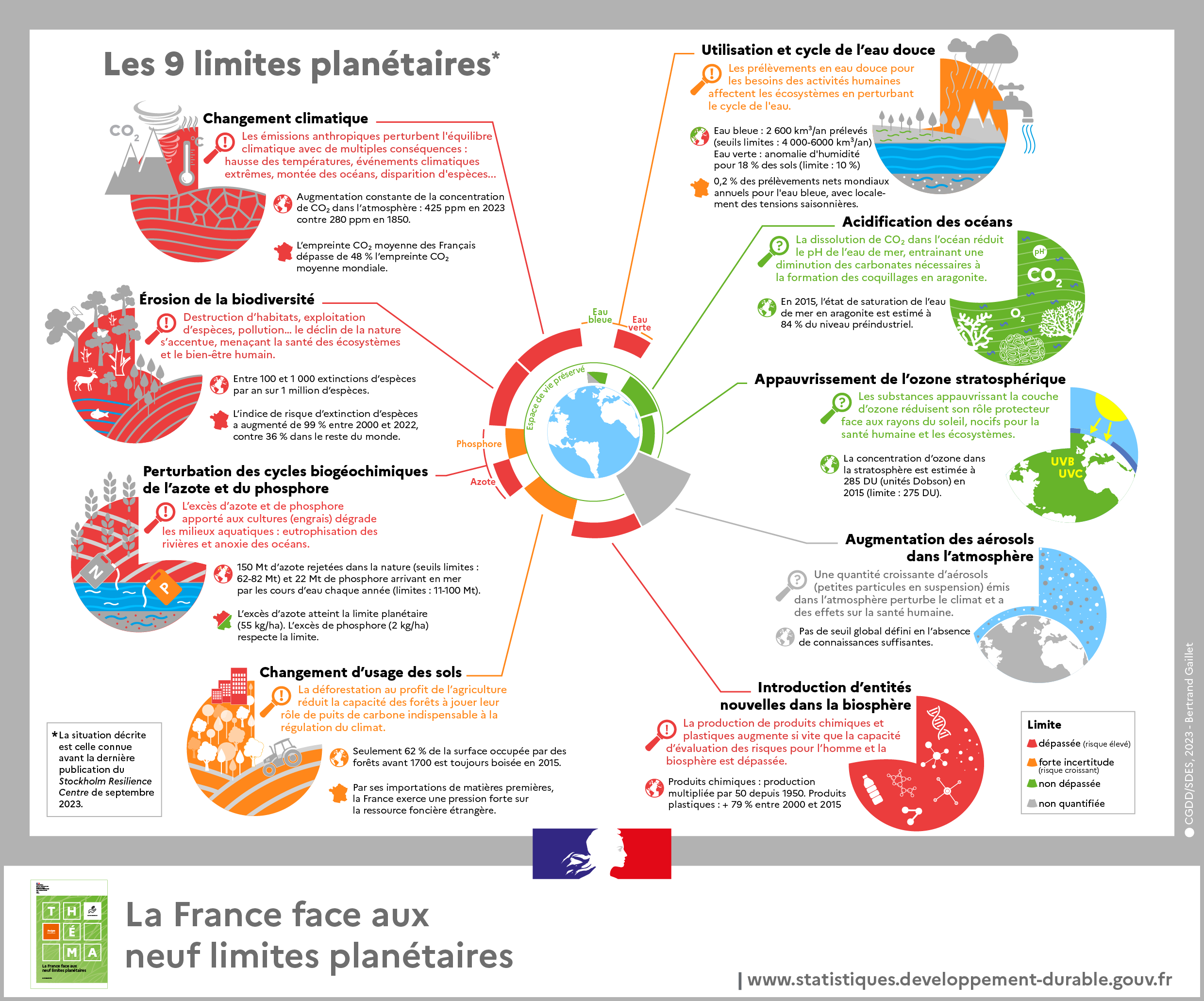 Les limites planétaires sont des seuils quantitatifs à ne pas dépasser si on veut préserver le fonctionnement et l’équilibre de l’éco-système « Terre ». Au nombre de 9, ils ont été définis en 2009 par une équipe internationale de 26 chercheurs conduite par le suédois Johan Rockström.